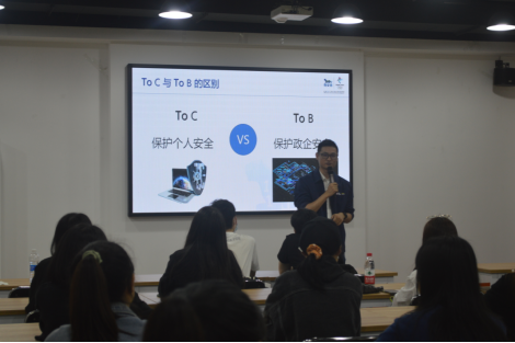 宣讲会中,朱经理以个人安全和政企安全两个不同的应用场景为对比,让同学们对网络安全形成较为清晰直观的认知。朱经理表示在一些重要活动和项目中,都需要网络安全技术作为保障,并以网络安全技术如何维护奥运会正常运行为例,让同学们深刻体会到了网络安全技术的重要性。最后,朱经理介绍了奇安信集团的企业文化,运营方向,并欢迎同学们到集团参观了解。