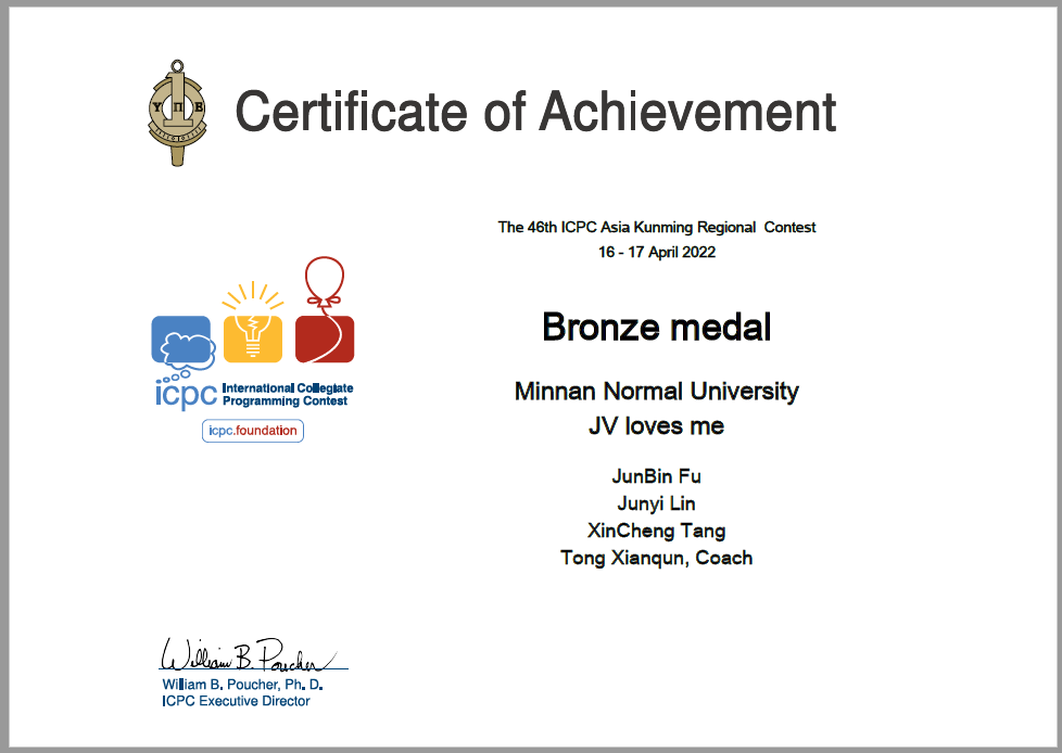 4月16-17日,2022年第46届ICPC国际大学生程序设计竞赛亚洲区域赛昆明站比赛顺利举行,比赛采用线上方式。有来自清华大学、北京大学、南京大学等各个高校的697个队伍共2091名同学参赛。我校万象城awc官网登录入口ACM队员唐鑫程、林俊逸、傅俊斌,3名同学组成的队伍在比赛中发挥出色,获得铜奖。