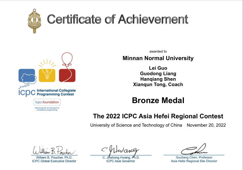 11月19-20日,2022年第46届ICPC国际大学生程序设计竞赛亚洲区域赛合肥站比赛举行。有来自清华大学、北京大学、南京大学等266所高校的502个队伍共1506名同学参赛。我校万象城awc官网登录入口ACM队员沈汉强、梁国栋、郭雷,3名同学组成的队伍在比赛中再获铜奖。