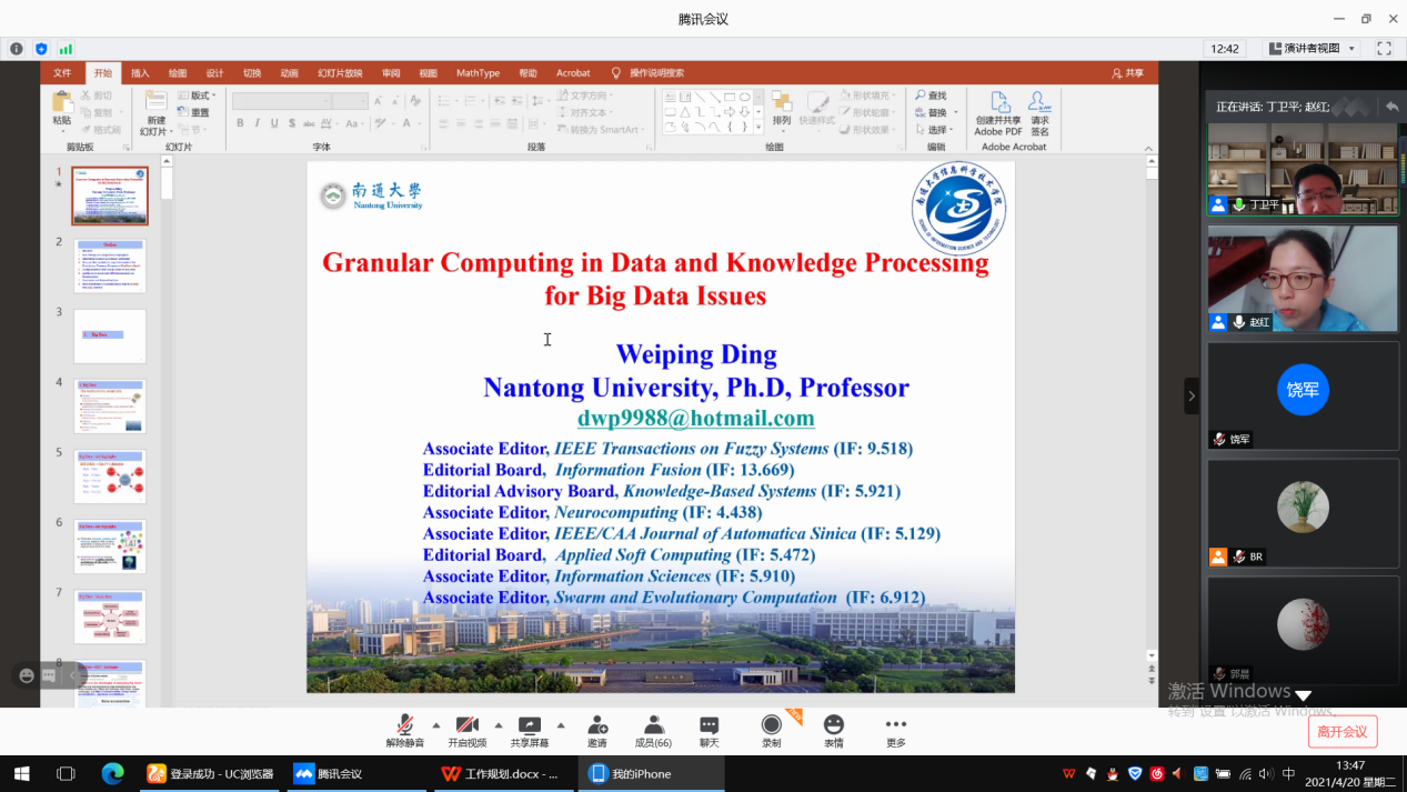 4月20日下午,万象城awc官网登录入口在线上举行了“Granular Computing in Data and Knowledge Processing for Big Data Issues”学术报告,主讲人为南通大学信息科学技术学院副院长、博士生导师丁卫平教授。讲座由赵红教授主持,学院相关方向教师和全体研究生参加了本次报告会。