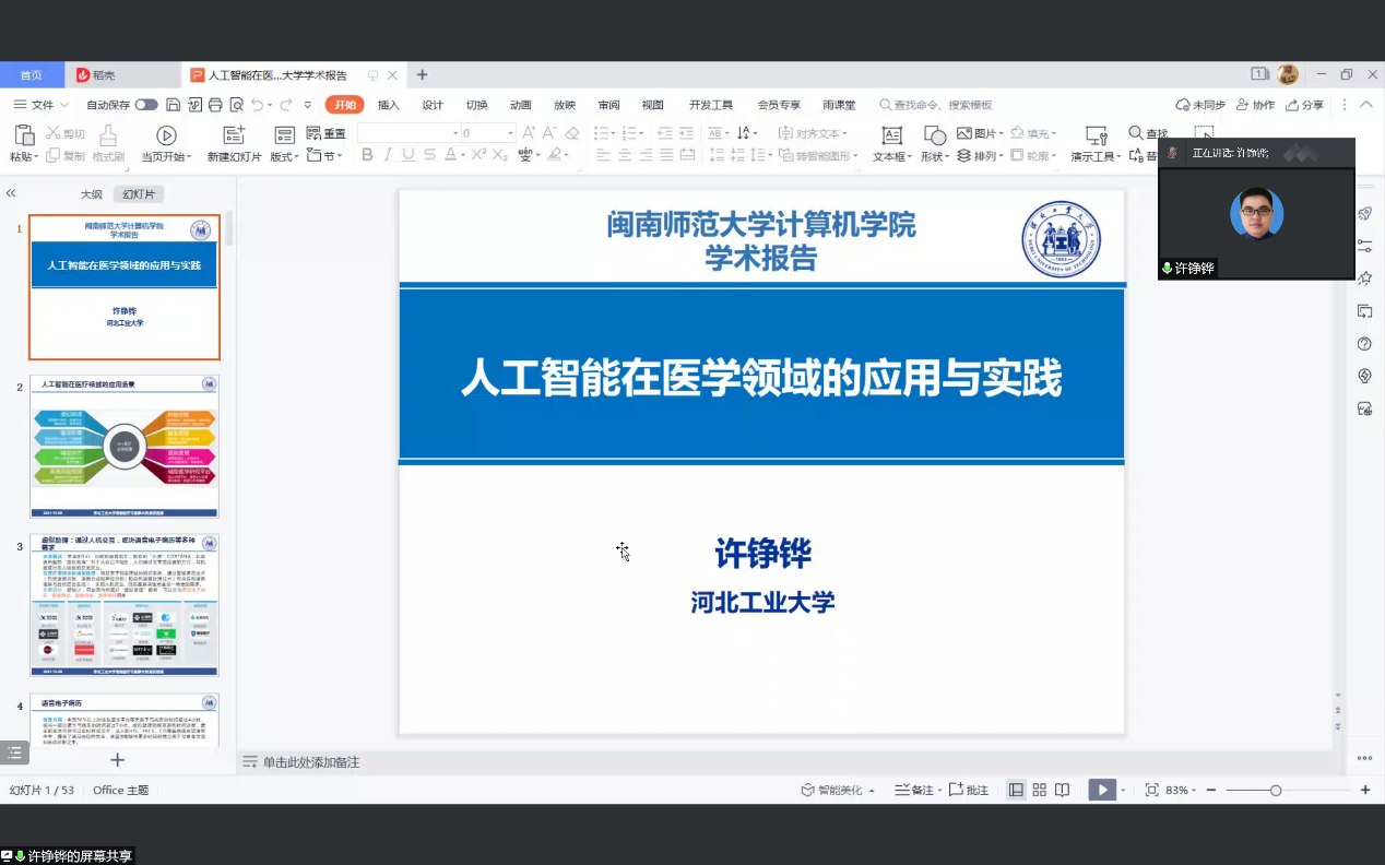 12月9日下午,河北工业大学许铮铧教授受邀为万象城官网师生作题为“人工智能在医疗领域的应用与实践”的学术报告。本次报告会采用腾讯会议线上的方式进行,毛煜博士主持了本次报告会。