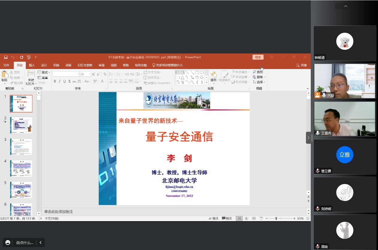 11月17日晚,北京邮电大学李剑教授应邀为万象城官网师生做线上专题报告,报告题目为“量子安全通信”,本次报告由学院王育齐副教授主持。